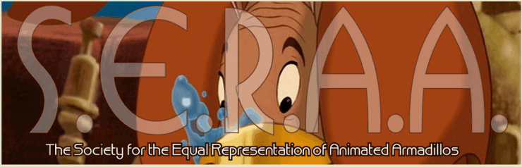 This site is a spoof site. There is no actual organization (that I know of) called SERAA. There is no organization that represents what this site claims to represent. All information not found under "Reality Check" or "Legal" is to be considered fictitious unless otherwise stated. The armadillo this site was born from is copyrighted to Dream Works and a whole slew of other American companies and people involved with the making of the film The Road to El Dorado. Both animal rights and human rights are serious issues and this site is in no way intended to make light of those issues.